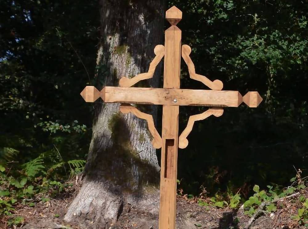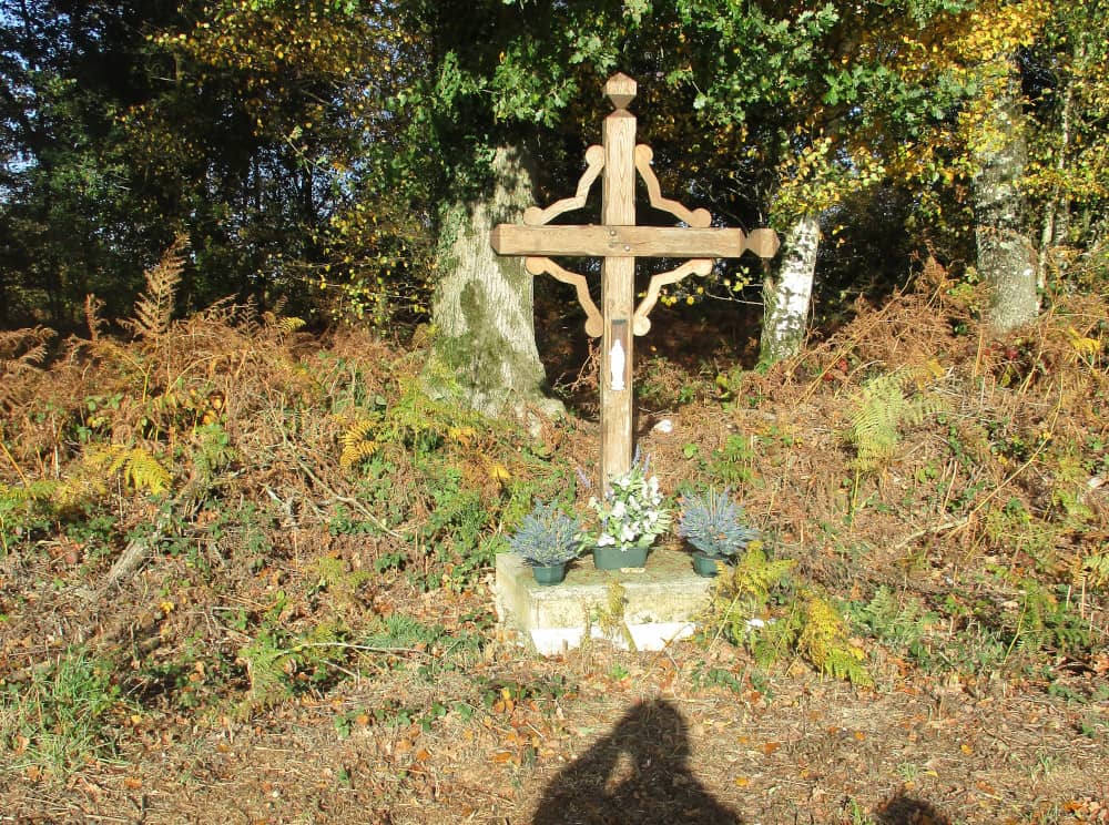 Cette croix en bois, très endommagée, fleuronnée et auréolée d’un quadrilobe avec petite niche grillagée en façade du fût, vestige d’une vierge a été refaite à l’identique par Monsieur H.Guilloux, menuisier de Guilliers à la commande de l’Association des croix. La Vierge dans la Niche a été donnée par Madame Duval.