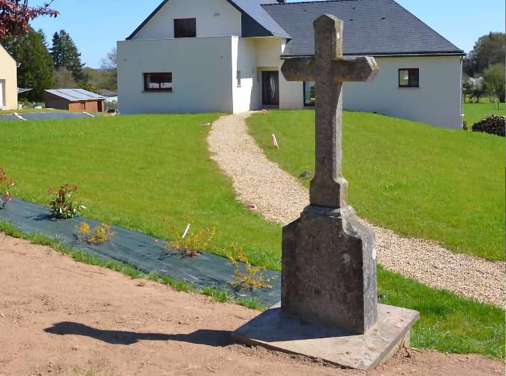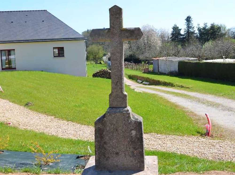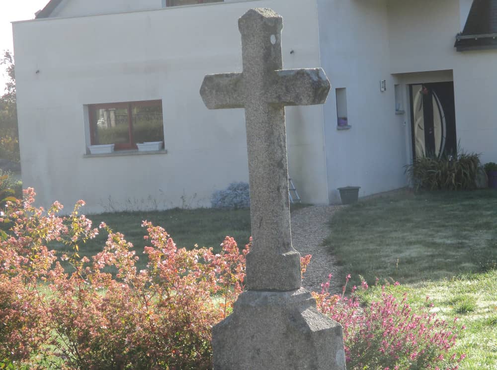 Cette croix au soubassement enterré pour partie, provient d’un cimetière, et est en maçonnerie de granit. Elle est placée sur un domaine privé.